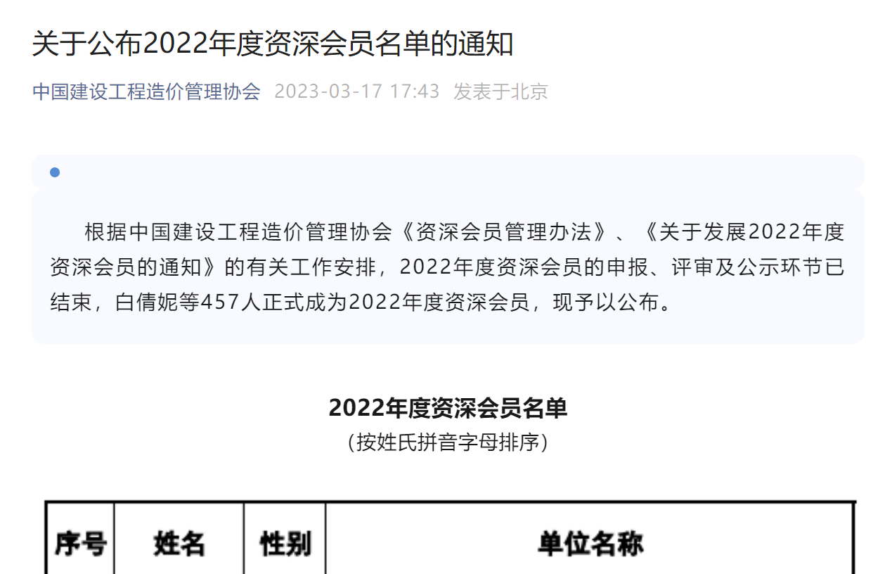 根據(jù)中國建設(shè)工程造價管理協(xié)會《資深會員管理辦法》、《關(guān)于發(fā)展2022年度資深會員的通知》的有關(guān)工作安排,2022年度資深會員的申報、評審及公示環(huán)節(jié)已結(jié)束,在公布的名單中,我集團副總經(jīng)理陸冬、總經(jīng)理助理謝宇翔正式成為中國建設(shè)工程造價管理協(xié)會資深會員。
